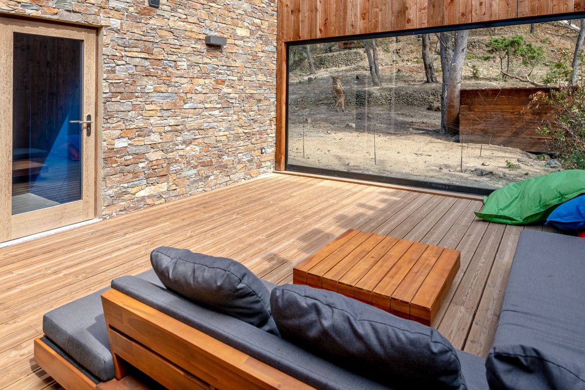 Per reduir l'impacte sobre l'espai natural, hem limitat el nombre d'eco-lodges a 12 per a 26 hectares, és a dir, una superfície màxima de només un 4%. Els nostres allotjaments estan coberts amb materials naturals com la fusta, la pedra o el corten de color rovell per integrar-se completament amb el paisatge.S'ha fet un esforç especial en el consum d'aigua, l'estalvi energètic i la instal·lació d'un sistema de depuració biològica vegetal. Tots els productes utilitzats per al manteniment dels eco-lodges estan certificats ecològics i respectuosos del medi ambient. Finalment, apliquem una política de limitació i reciclatge de residus..