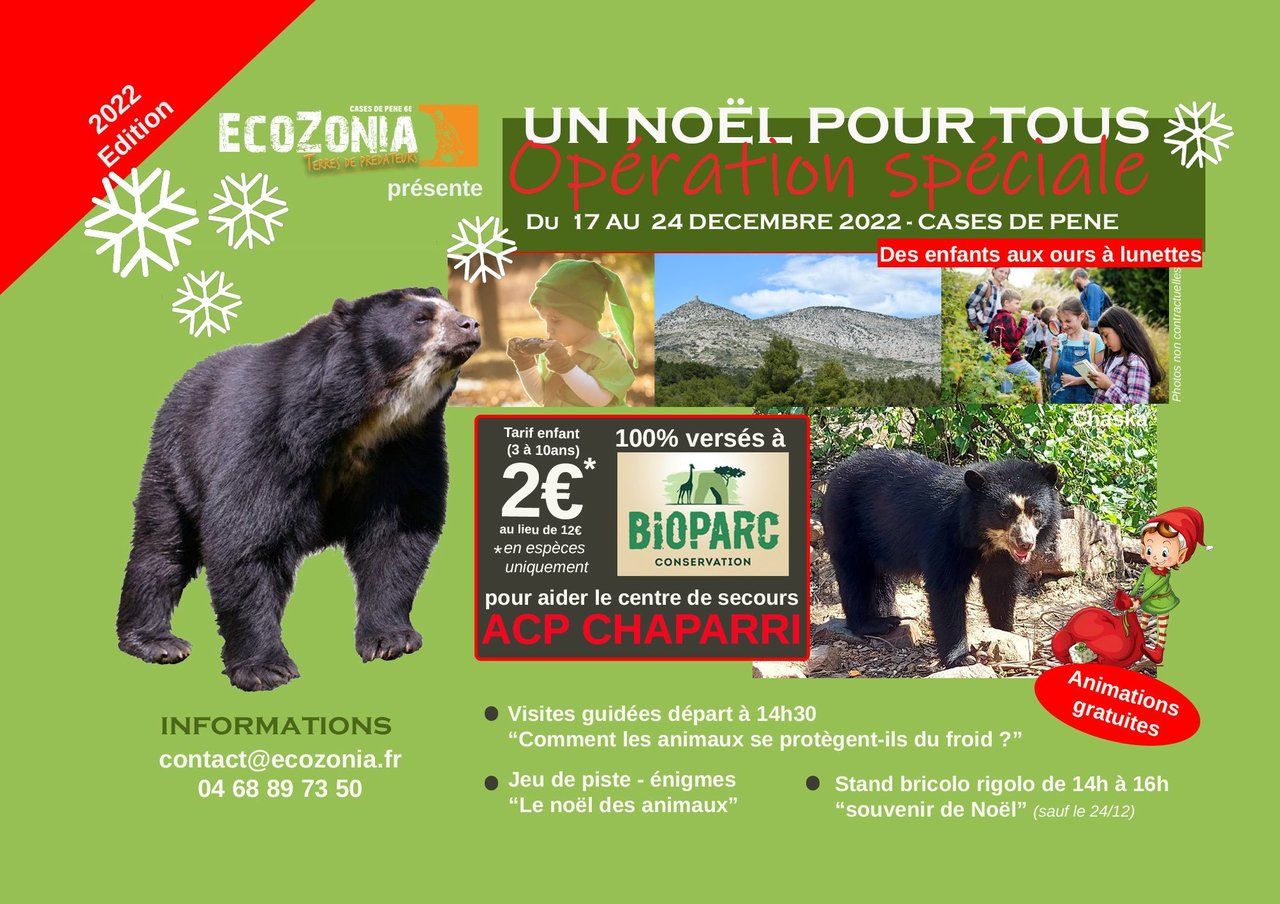 Pour cette opération spéciale, du 17 au 24 décembre inclus : le droit d'entrée pour les enfants sera à 2 euros au lieu de 12€, en espèces uniquement. En effet, ces 2 euros seront déposés par les enfants eux-mêmes dans une urne afin d'être reversés intégralement à Bioparc conservation pour aider le centre de secours ACP Chaparri qui accueille actuellement 6 ours à lunettes. L'objectif étant de pouvoir les relâcher dans le milieu naturel lorsqu'ils seront rétablis. Depuis 22ans, une dizaine d'ours a été réintroduite.