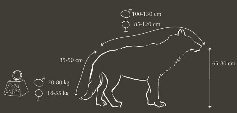 EX Eteinte au niveau mondial RE Disparue au niveau régional CR En danger critique EN En danger VU Vulnérable NT Quasi menacé LC Préoccupation mineureLoup gris Taille