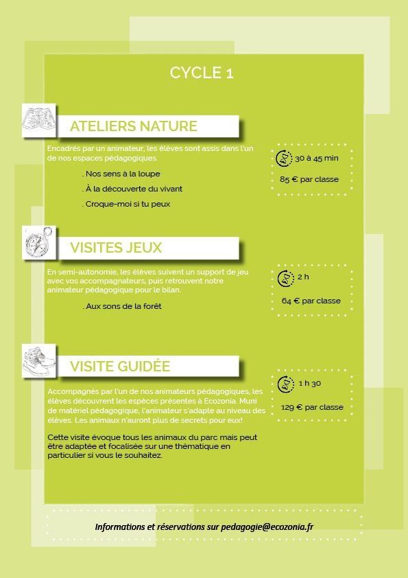 Chaque atelier est encadré par un médiateur scientifique du parc. Installés dans le parc, les participants aborderont un thème spécifique adapté à leur niveau. Les ateliers sont pluridisciplinaires et visent à consolider les objectifs de fin de cycle de manière ludique et participative.